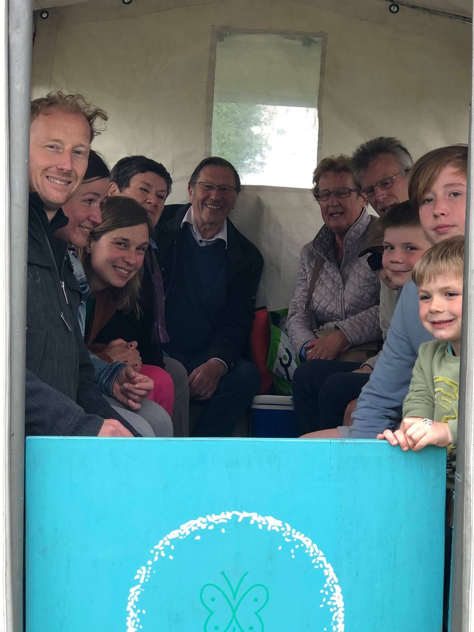 Onze huifkar is ingericht voor maximum 12 volwassen personen of 15 kinderen.